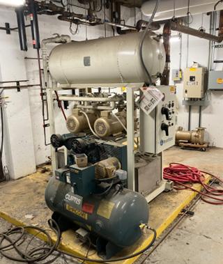 A central lab air compressor is located in the main mechanical room B008. It consists of duplex compressors, with 10 HP motors providing vacuum air service to the building. This piece of equipment was installed around 2006. Both pumps required replacement on two different occasions over the last seven years. In addition to on-going regular service and maintenance, expect frequent pump replacement going forward. There are 1.5” piping risers which serve vacuum to all the lab suites in the building.