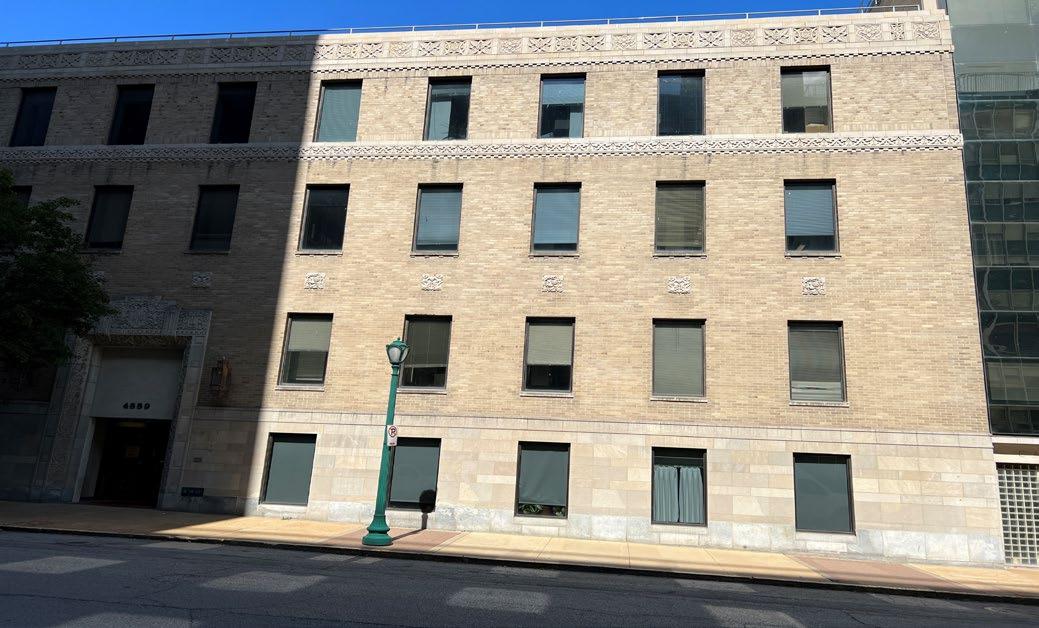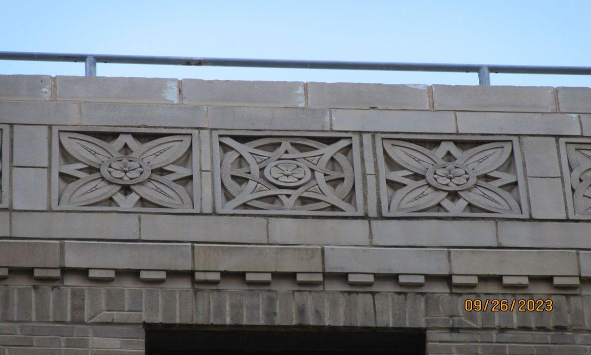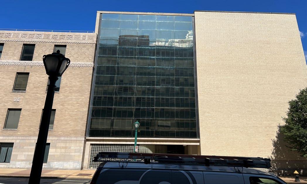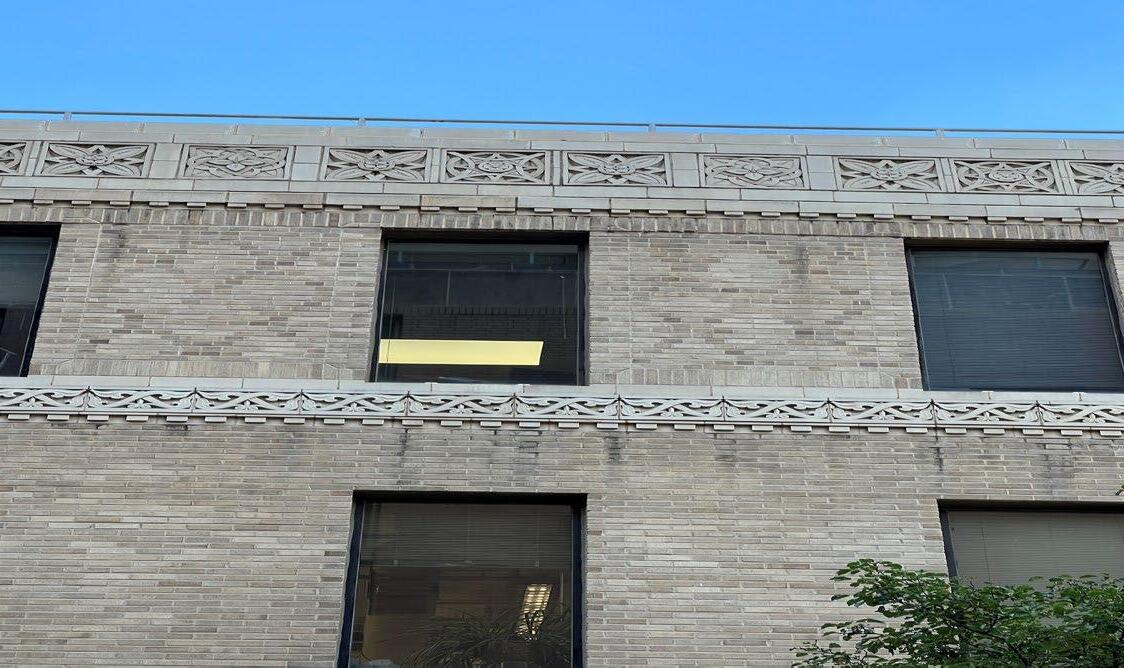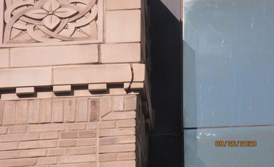 There is some discoloration on the limestone over time, this is an aesthetic issue. The limestone cornice (Approx. 48”), and horizontal limestone band just below the fourth floor windows are in need of re-pointing to seal any open joints. The brick coursing just below this band should also be re-pointed. Sealant may have been applied in some of these areas. The upper most coping stone that caps this wall should have the sealant joints removed, cleaned and new sealant applied throughout the building. Joints appear to be losing adhesion.