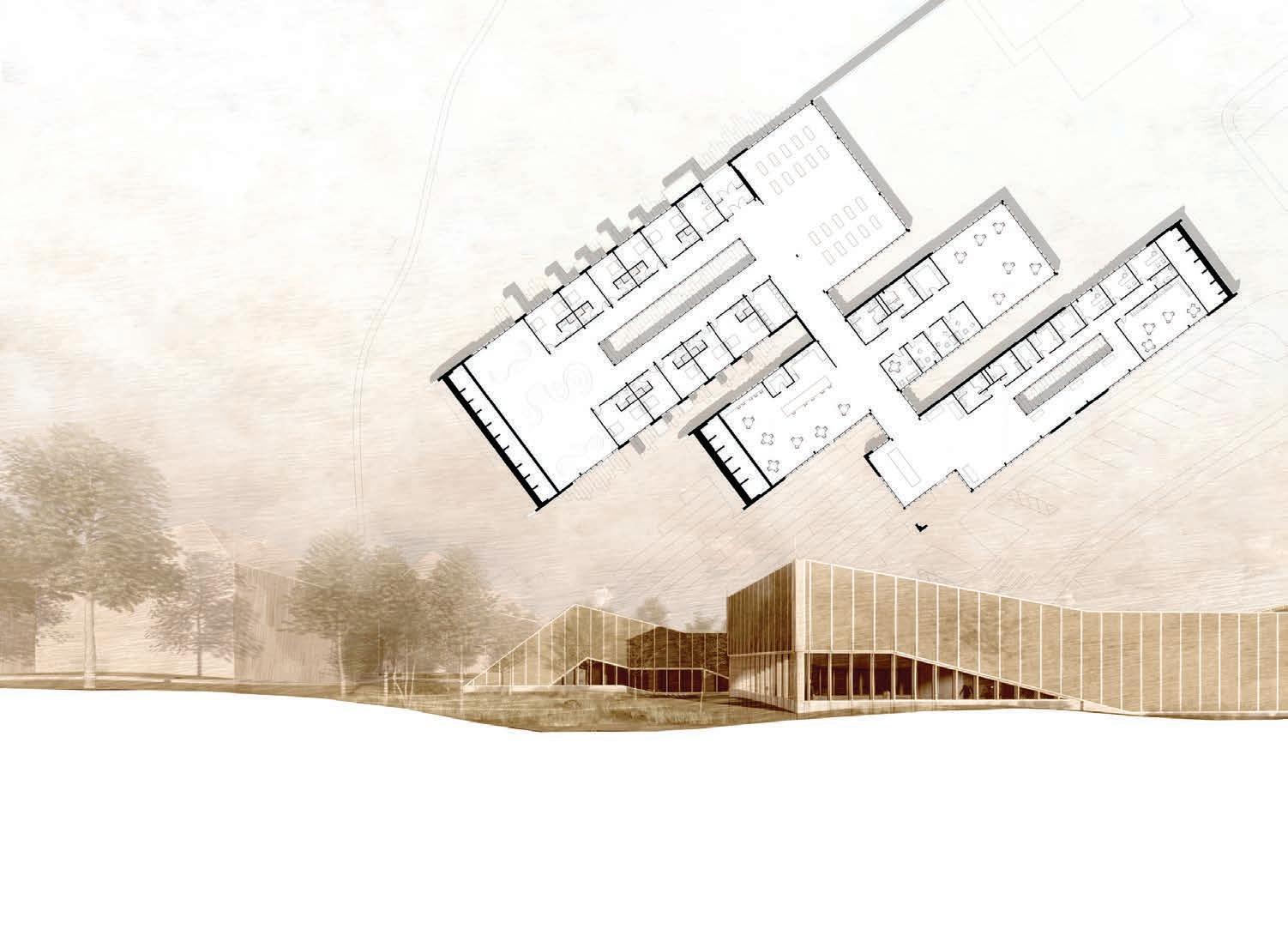 Kopychyntsi, Ukraine is a small community located on the western part of the country. This community is a haven for displaced people from the Ukrainian war. This community has a large surge of growth to accommodate for in the coming years. Our studio was tasked with doing a master planning exercise and defining what the community was lacking and designing for those typologies. I found it important to design for the post war community. A holistic rehabilitation center for displaced families with war trauma and the rest of the community will greatly benefit the city. I used conceptual form making to derive my form and generate biophilic elements in my building to connect the users to nature. The building sits on a public works site which has a great walking distance to the city center. We worked with a prior student who works in Ukraine to get a sense of the community needs. Our studios projects as a whole will help to generate conversation and inspire the community of Kopychyntsi when they are featured in a community meeting. The objectives were to paint a picture and experience for the community for how our design thinking could help to benefit their town.