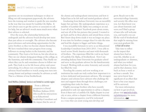 questions are on recruitment techniques or ideas or filling out risk management paperwork, the advisors have the training and wisdom to guide the zeta member in the way that was meant by Lambda Chi Alpha. It isn’t always easy to get the actives or associates to ask for help, but an advisor’s words mean much more when their advices is solicited. Over the years, the relationship between the undergrads and the advisory board develop into more than just advice or oversight. The advisors also become great references and networking opportunities for the active brothers as they too become alumni themselves. We have watched these men progress from young followers to strong leaders in the fraternity and the community. They learn a lot from us, but also about us. They see our alumni doing great things at the college, in the fraternity, and with the community. They finally see where they can be and sometimes choose to follow our path. They look to us for life lesson advice and career networking. It is always very rewarding for the alumni advisory board members to watch young men turn into young alumni and perhaps someday be advisors as well. That is a lifetime of true brotherhood.