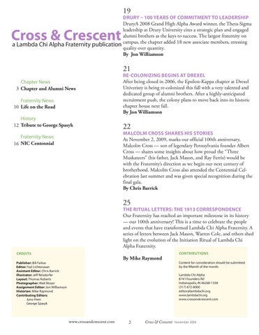 Contributions Content for consideration should be submitted by the fiftenth of the month. Lambda Chi Alpha 8741 Founders Rd Indianapolis, IN 46268-1338 (317) 872-8000 editor@lambdachi.org www.lambdachi.org www.crossandcrescent.com