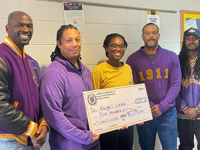 Ms. Abigail Loken won Third Place in the Omega Psi Phi 13 International District Essay Contest, competing against other Chapter level winners across the 13 District. The Lambda Xi Chapter Executive Council visited Humphreys High School and presented Ms Loken with a check in the amountof$400infrontofherclass