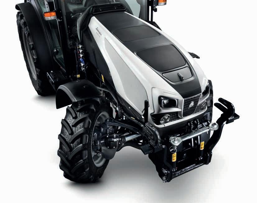 curvas, y Anticabeceo, que aumenta la seguridad de frenado. Independientemente del eje delantero que vaya montado en el tractor (fijo o suspendido), los frenos en las cuatro ruedas siempre están incluidos de serie, así como el bloqueo total de los diferenciales. El sistema SDD, que reduce a la mitad el número de vueltas de volante necesarias para realizar un giro completo, además, la doble tracción auto conecta y desconecta automáticamente la tracción a las cuatro ruedas en función de la velocidad de avance y del ángulo de giro.