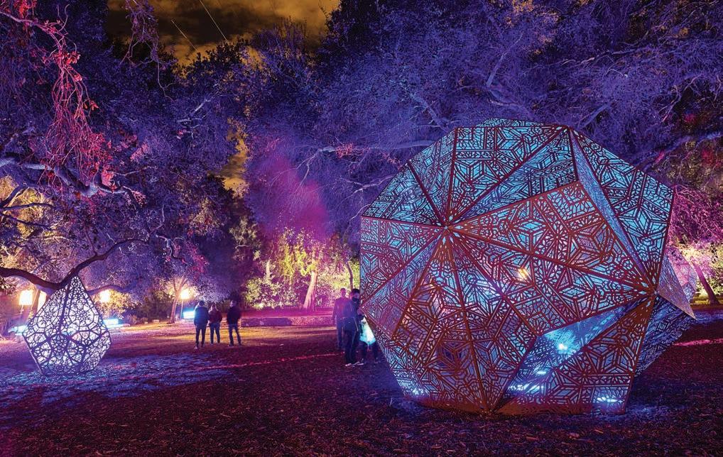 BY SARA SMOLADescanso Gardens’ interactive night walkincludes an entire town of stained-glass creations by contemporary sculptor Tom Fruin, installations from collaborative studio HYBYCOZO, and lighting effects throughout the “Ancient Forest.” For an exclusive rst look, a preview party fundraiser (proceeds directly bene t the gardens) on November 19 will give visitors a chance to experience the show before it opens to the public November 20–January 8. $22–$40, preview party $195/person; descansogardens.org