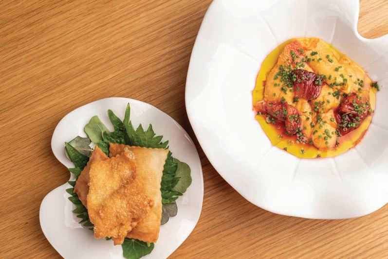 “We have a collective of sustainable and local options,” notes Crisp. This includes purple savory clams from Hama Hama Oyster Company in Lilliwaup, Wash., local mussels from Hope Ranch, and black mussels from Santa Barbara Mariculture. “We are predominantly using a sushi-grade Ora King salmon from New Zealand or Baja Aquaculture striped bass. Both companies practice unmatched sh-ranching practices with a low to zero impact for carbon or waste emission along with respect for the environment and ecosystem they farm in.”