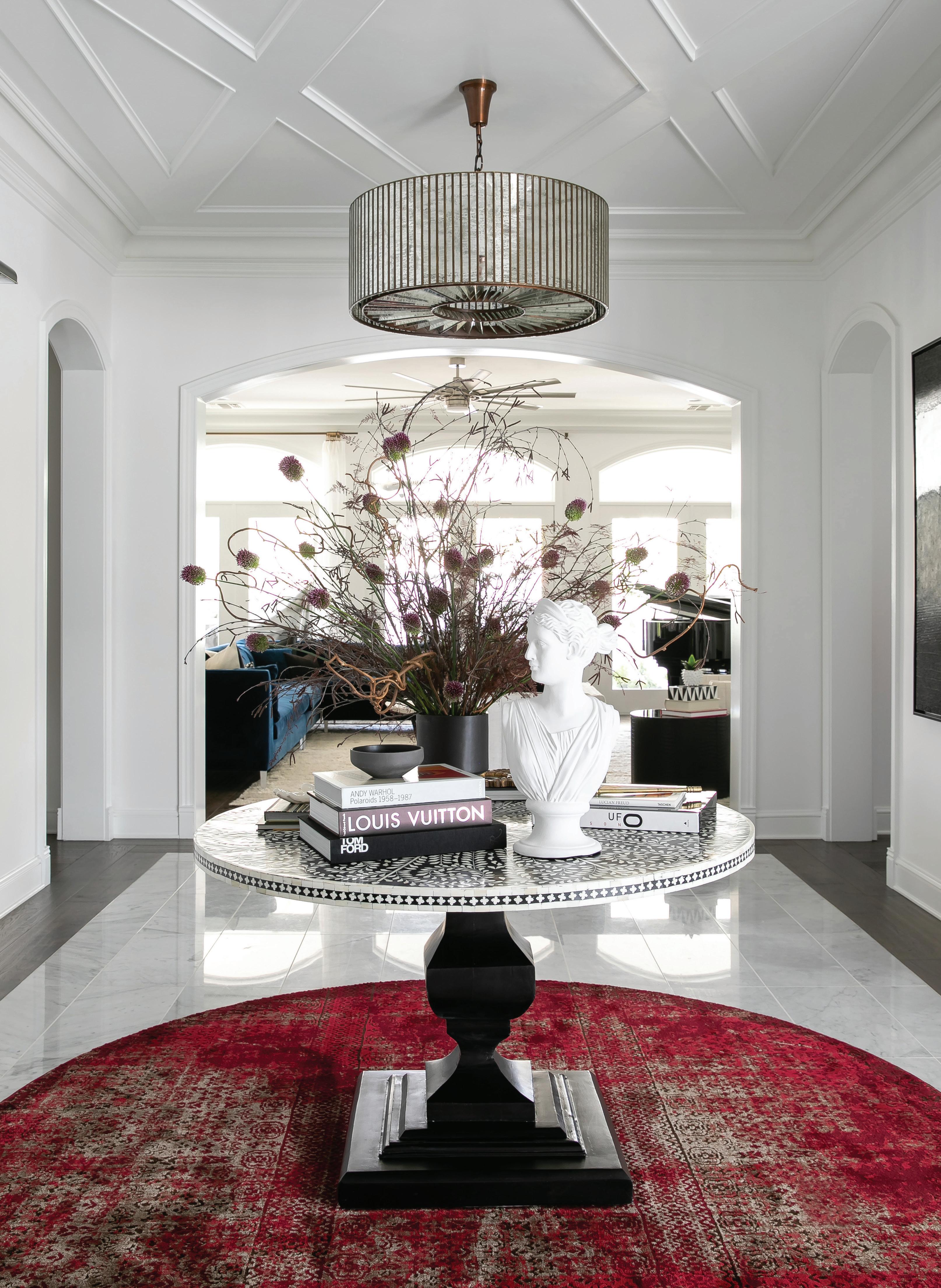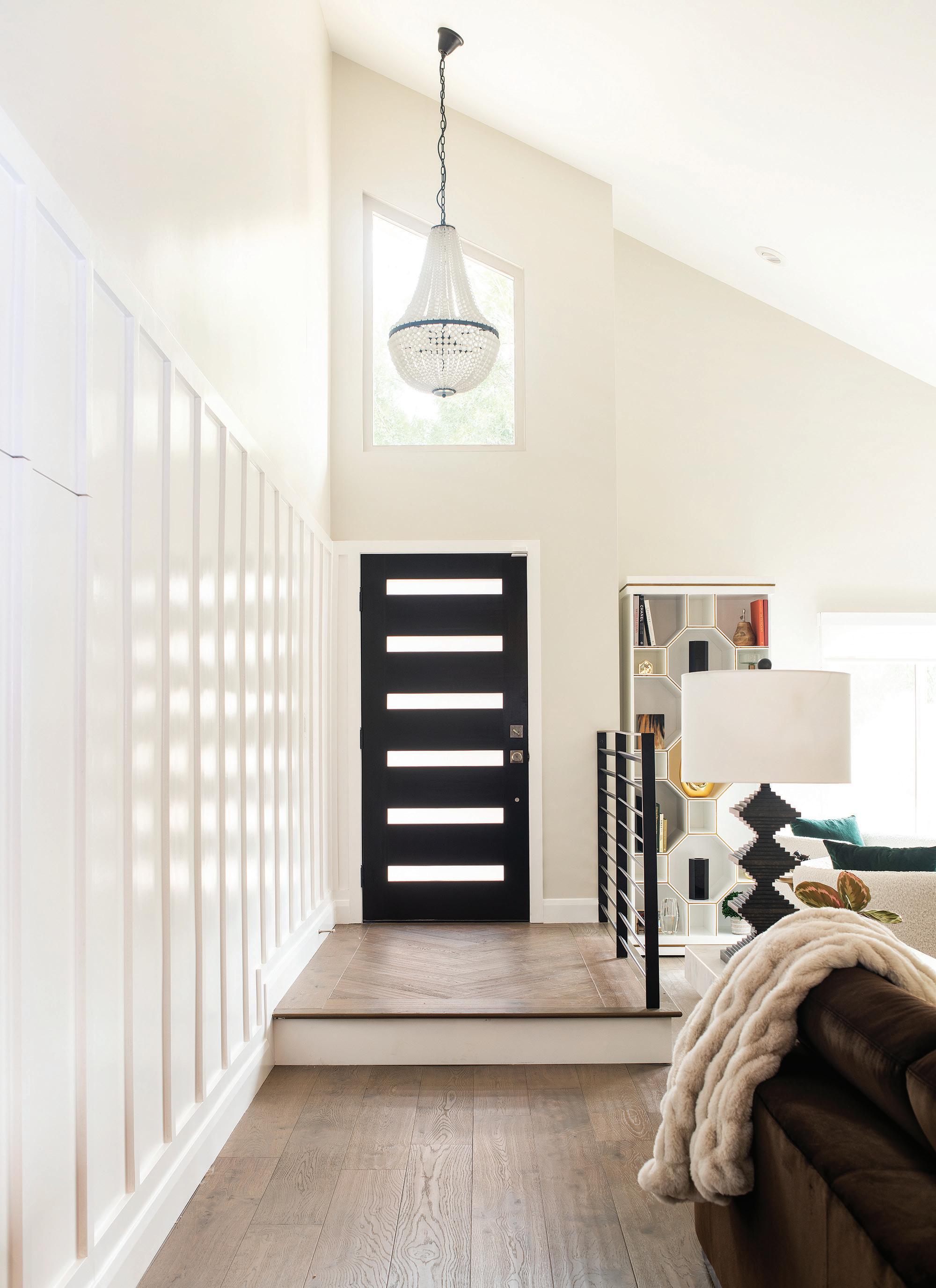 As you enter the Foyer, board and batten wall details hide a secret coat closet, and guests are welcomed by a brushed glass chandelier from Noir