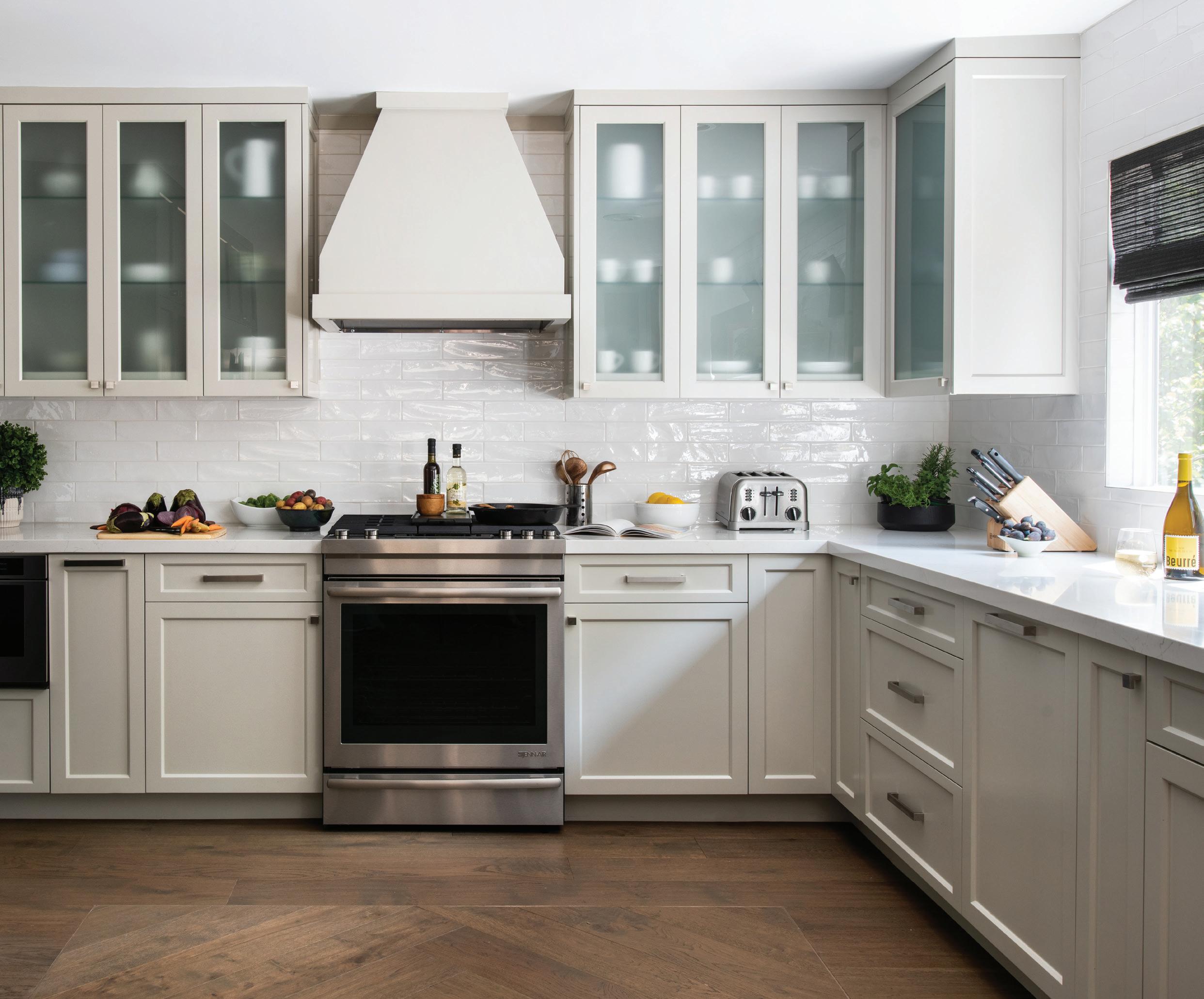 kThe kitchen went through a complete overhaul. Custom cabinetry is painted in a grey finish and shows just a hint of what lies within through frosted milk glass