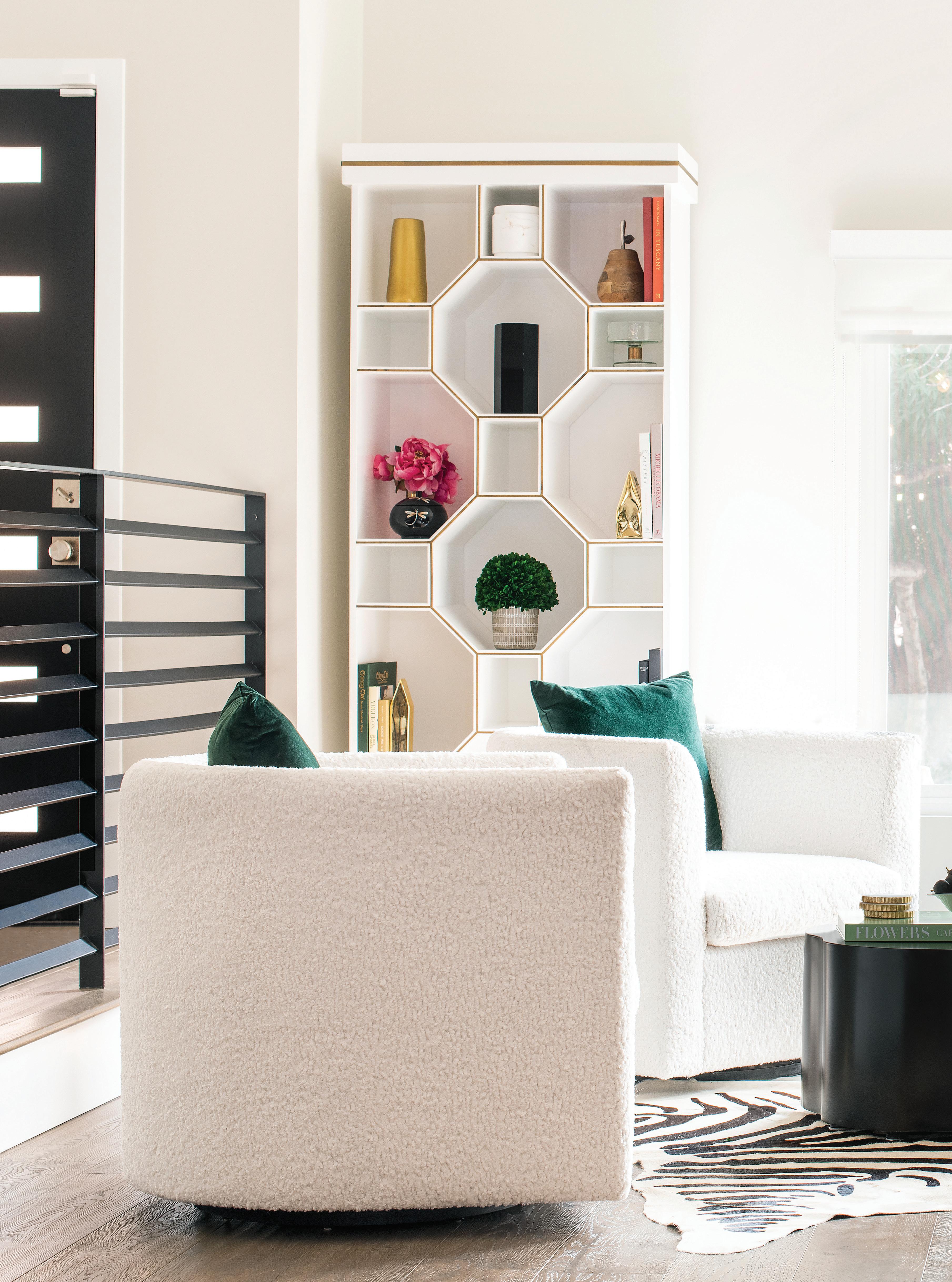 A color palette of black, white, brown, gray, and green lends a sophisticated, timeless feel. “This classic combination provides an aesthetic that will be as appropriate in 30 years as it is now,” says McClain. He added mixed metallic accents, bold pops of color, and geometric patterns to provide visual interest.