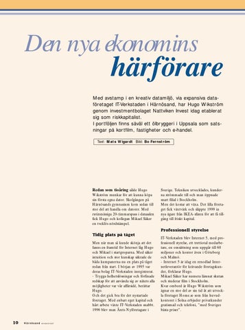 Med avstamp i en kreativ datamiljö, via expansiva dataföretaget IT-Verkstaden i Härnösand, har Hugo Wikström genom investmentbolaget Nattviken Invest idag etablerat sig som riskkapitalist. I portföljen finns såväl ett ölbryggeri i Uppsala som satsningar på kortfilm, fastigheter och e-handel. Text: Mats Wigardt Bild: Bo Fernström