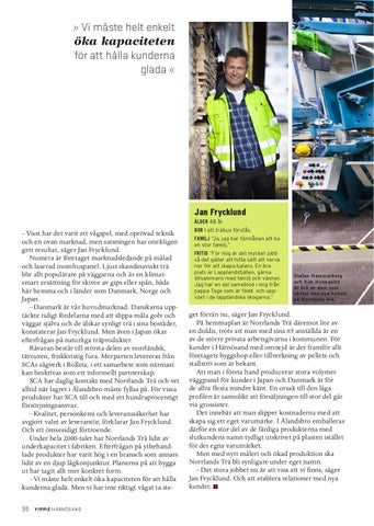 – Visst har det varit ett vågspel, med oprövad teknik och en ovan marknad, men satsningen har onekligen gett resultat, säger Jan Frycklund. Numera är företaget marknadsledande på målad och laserad inomhuspanel. Ljust skandinaviskt trä blir allt populärare på väggarna och är en klimatsmart ersättning för skivor av gips eller spån, både här hemma och i länder som Danmark, Norge och Japan. – Danmark är vår huvudmarknad. Danskarna upptäckte tidigt fördelarna med att slippa måla golv och väggar själva och de älskar synligt trä i sina bostäder, konstaterar Jan Frycklund. Men även i Japan ökar efterfrågan på naturliga träprodukter. Råvaran består till största delen av norrländsk, tätvuxen, friskkvistig fura. Merparten levereras från SCAs sågverk i Bollsta, i ett samarbete som närmast kan beskrivas som ett informellt partnerskap. SCA har daglig kontakt med Norrlands Trä och vet alltid när lagret i Älandsbro måste fyllas på. För vissa produkter har SCA till och med ett hundraprocentigt försörjningsansvar. – Kvalitet, personkemi och leveranssäkerhet har avgjort valet av leverantör, förklarar Jan Frycklund. Och ett ömsesidigt förtroende. Under hela 2000-talet har Norrlands Trä lidit av underkapacitet i fabriken. Efterfrågan på ytbehandlade produkter har varit hög i en bransch som annars lidit av en djup lågkonjunktur. Planerna på att bygga ut har tagit allt mer konkret form. – Vi måste helt enkelt öka kapaciteten för att hålla kunderna glada. Men vi har inte riktigt vågat ta ste30