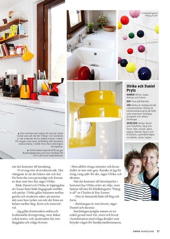 – Men alltför röriga mönster och krusiduller är inte min grej. Kanske är jag för rörig i mig själv för det, säger Ulrika och skrattar. När det kommer till favoritprylar i hemmet har Ulrika svårt att välja, men fastnar till slut för klädhängaren "Hangit-all" av Charles & Ray Eames. – Den är fantastisk både till färg och form. – Snöslungan är min favorit, säger Daniel och skrattar. Inredningen präglas annars av en enkel grund med vitt, svart och brunt i kombination med roliga detaljer som betyder något för familjemedlemmarna. YI PPI E H ÄR N Ö SAN D