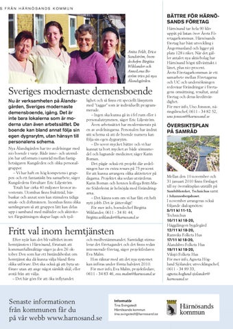 lighet och så finns ett speciellt låssystem med ”taggar” som är individuellt programmerade. – Ingen ska kunna gå in i fel rum eller i personalutrymmen, säger Eric Liljeström. Även arbetssättet har moderniserats på en av avdelningarna. Personalen har ändrat sitt schema så att de boende numera kan följa sin egen dygnsrytm. – De sover mycket bättre och vi har kunnat ta bort mycket av både sömnmedel och lugnande mediciner, säger Karin Boman. Det pågår också ett projekt där avdelningen har en extra resurs på 75 procent för att kunna arrangera olika aktiviteter på dagarna. Projektet ska sedan utvärderas. Karin Boman och hennes kollega Britt-Marie Söderkvist är helnöjda med förändringarna. – Det känns som om vi har fått ett helt nytt jobb. Det är jätteroligt! För mer info, boendechef Birgitta Wiklander, 0611 - 34 81 44, birgitta.wiklander@harnosand.se