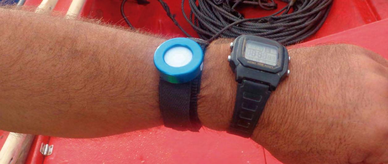La ubicación de los dosímetros personales se decidió bajo la condición de no interferir con el trabajo de los pescadores (Figura 2 y 3).