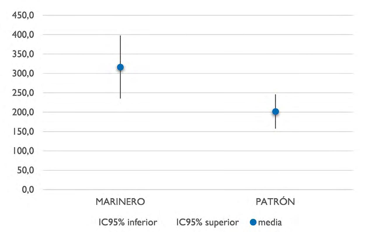 En cuanto al análisis por puesto de trabajo, realizado únicamente para la modalidad de arrastre, se observa que existen diferencias significativas entre la RUV solar a la que se ven expuestos los patrones y los marineros de modo que, aunque en todos los casos se supera el límite recomendado por la ICNIRP, para el puesto de marinero los valores son mucho más elevados que los recogidos para el puesto de patrón.