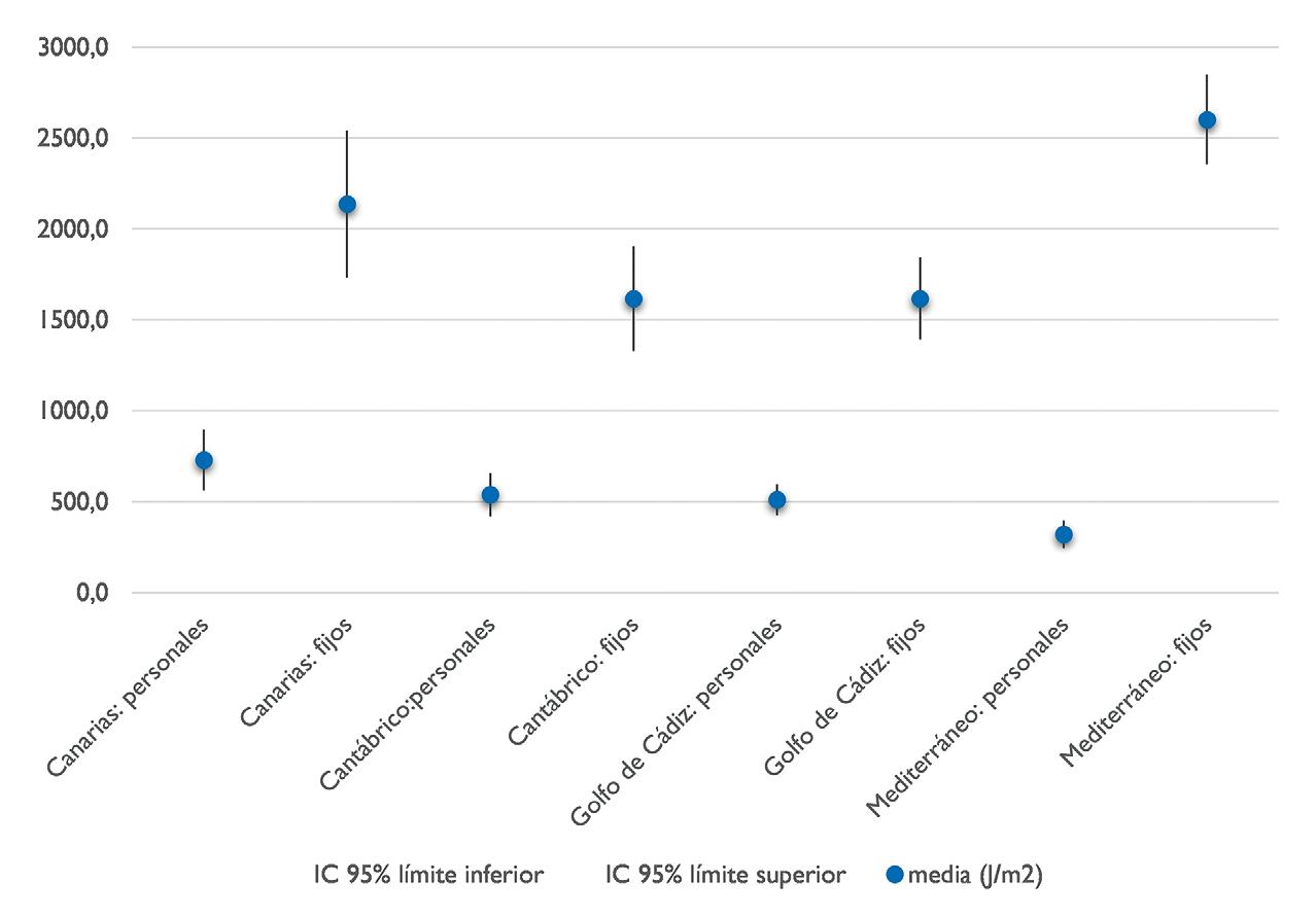 A modo de resumen, se puede afirmar que existe una gran diferencia entre la exposición a la que se ve sometida la tripulación de las dos modalidades de forma que, aunque en ambos casos se supera el límite recomendado, la modalidad de artes menores triplica la exposición frente a la modalidad de arrastre. Comparando de modo conjunto la modalidad y la zona del caladero, se puede observar que en arrastre los valores más bajos se encuentran en la zona del Cantábrico – Noroeste y en artes menores, los valores más bajos se encuentran en la zona del Mediterráneo.