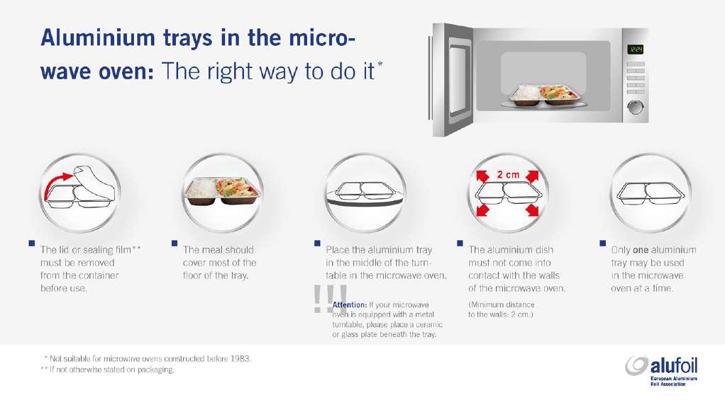 Kochen: Grill, Ofen, und Mikrowellen. Retorte geeignet: Aluminiumbehälter eignen sich zur Anwendung in Retorten, wenn sie mit geeignetem Oberflächenlack behandelt werden.