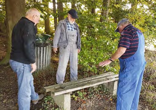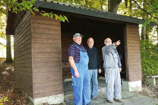 So ist es Bartschat Anfang des Jahres auch nicht entgangen, dass die Wander hütte am Rochusberg in die Jahre gekom men war und er nutzte die Mitgliederver sammlung im April, um für eine Frischzel lenkur der hochgelegenen Raststätte zu werben. Schon bald darauf gründete sich eine mobile Einsatztruppe. Horst Depenthal, Jürgen Eversmann und Peter Spach machten sich mit viel Herzblut an die Arbeit. Sie inspizierten den Zustand des höl zernen Unterstandes und entschieden sich, das marode Dach kom plett zu erneuern. Die Unterkonstruktion dafür konnte aus Bordmit teln erstellt werden – für die Trapezplatten spannte Horst Depenthal den Hänger an, um diese von Fa. Nordblech aus Holdorf abzuholen. Danach widmete man sich dem Neuanstrich der Hütte und weiteren