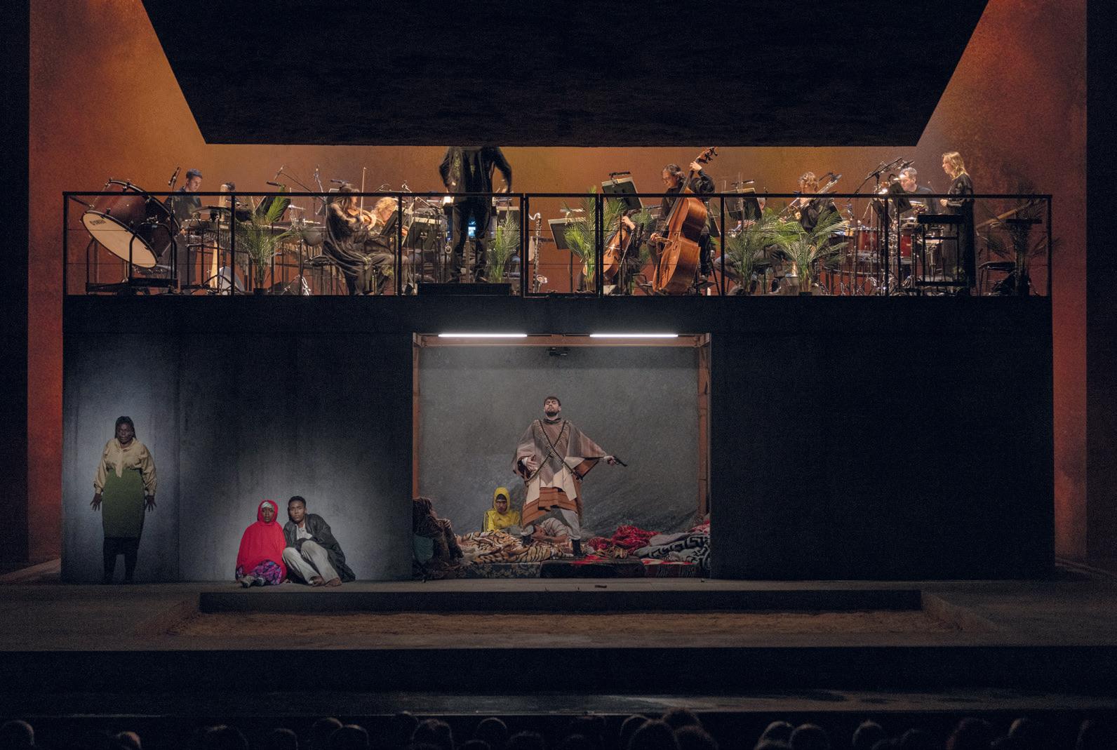 In een opera bevindt het orkest zich meestal in een lager gelegen ruimte vlak voor het podium – de orkestbak. Maar in deze opera spelen de muzikanten uitzonderlijk op het podium. Ze zijn duidelijk zichtbaar op een platform boven het podium.