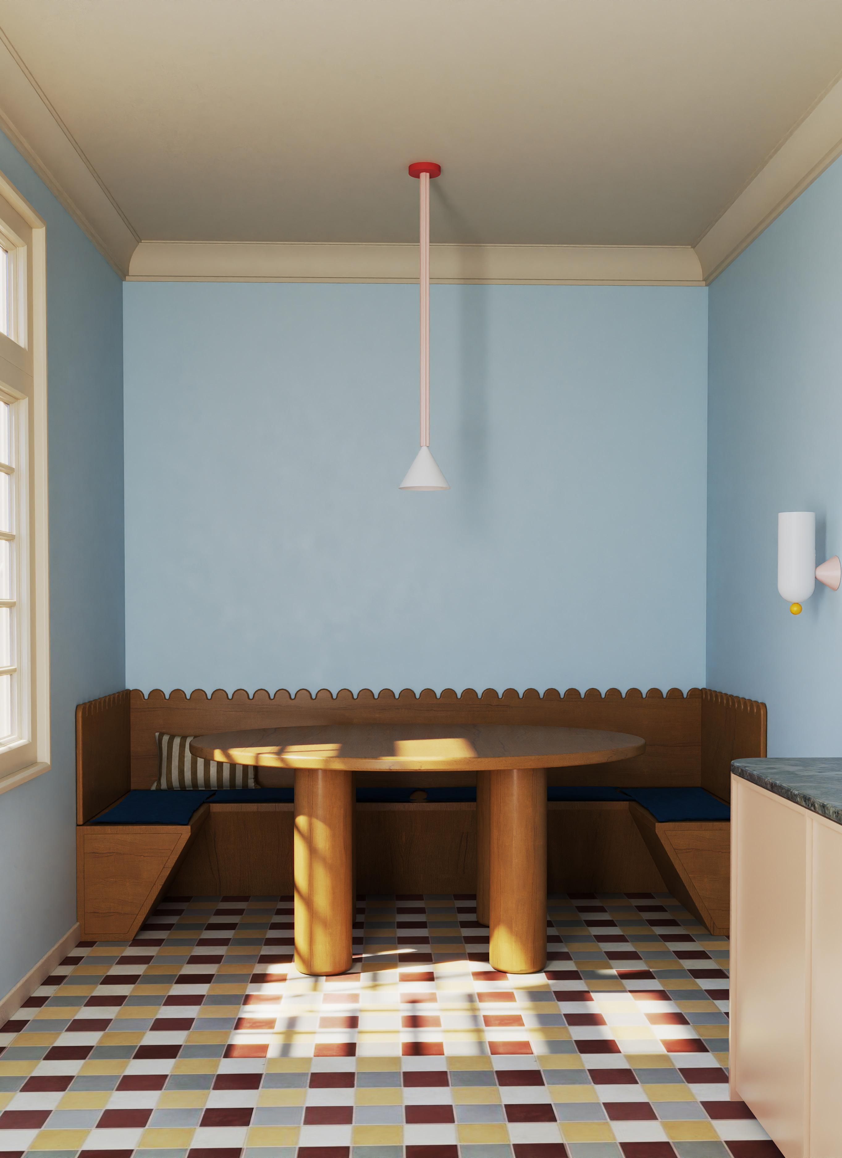 To break this rigid spatial arrangement of parallel lines and rectangular rooms, objects and interstitial spaces, we introduced objects with different geometries. The parallelogram table, the trapeze table or the circle with a cut table all create dynamic interstitial spaces. Interstitial spaces that are smaller on one side and more generous on another, spaces that create more variety and liveliness.