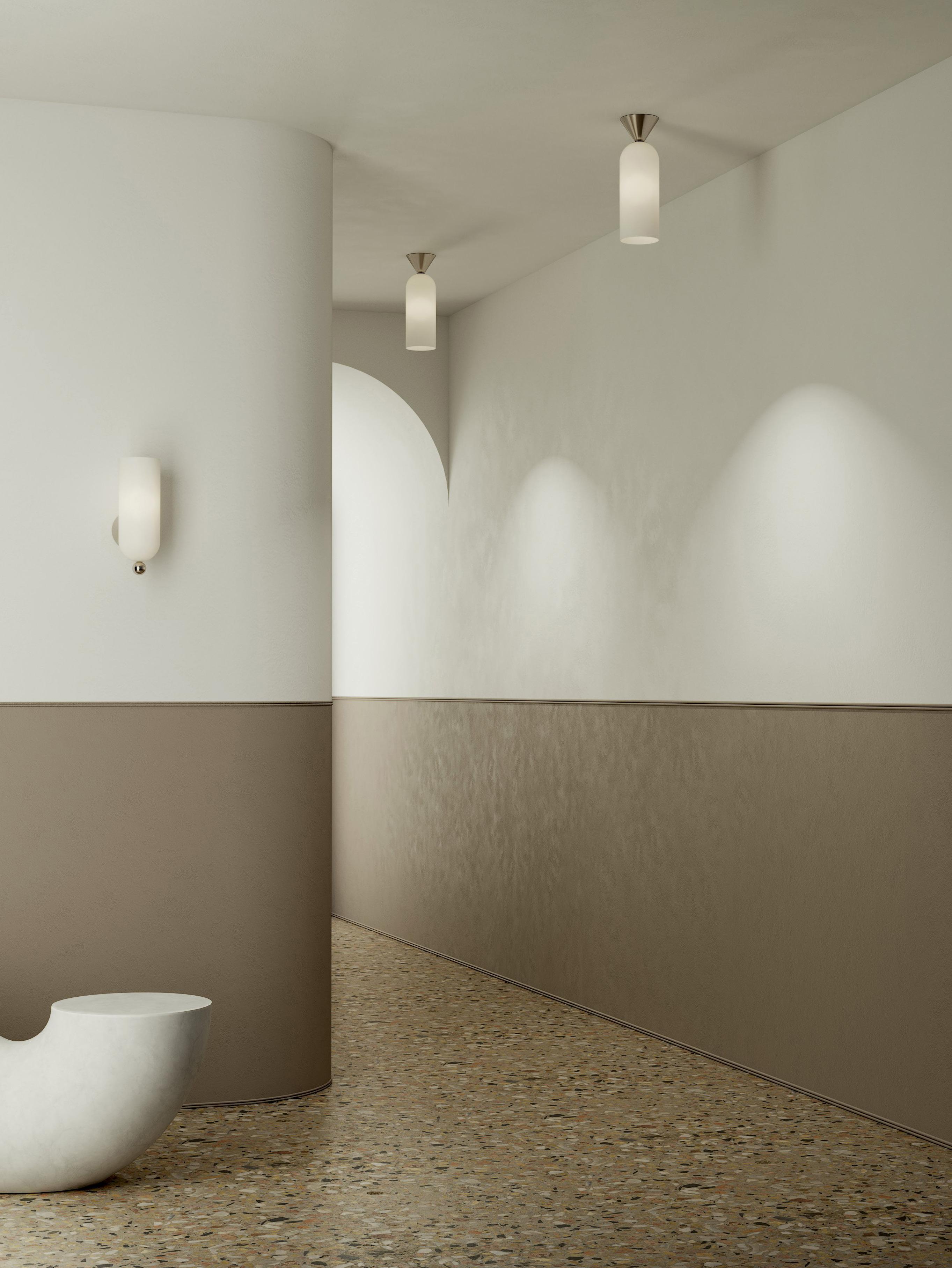 The topic of symmetry and the archaic is further explored in lights such as the Salzburg wall lights, the Six Tubes ceiling light or the Tulip family.