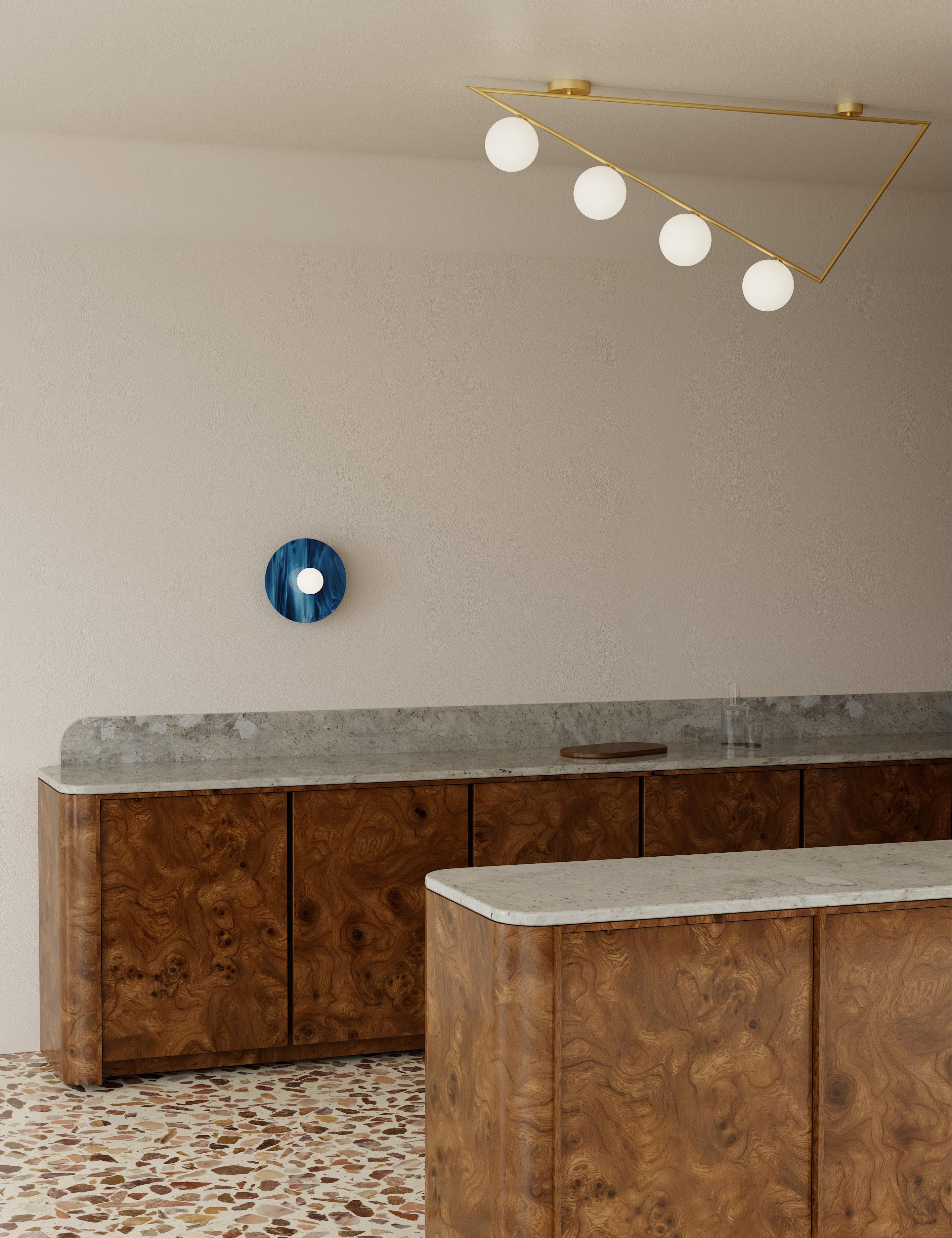 Throughout the years, we continued working with brass and simple geometries combined with white globes.