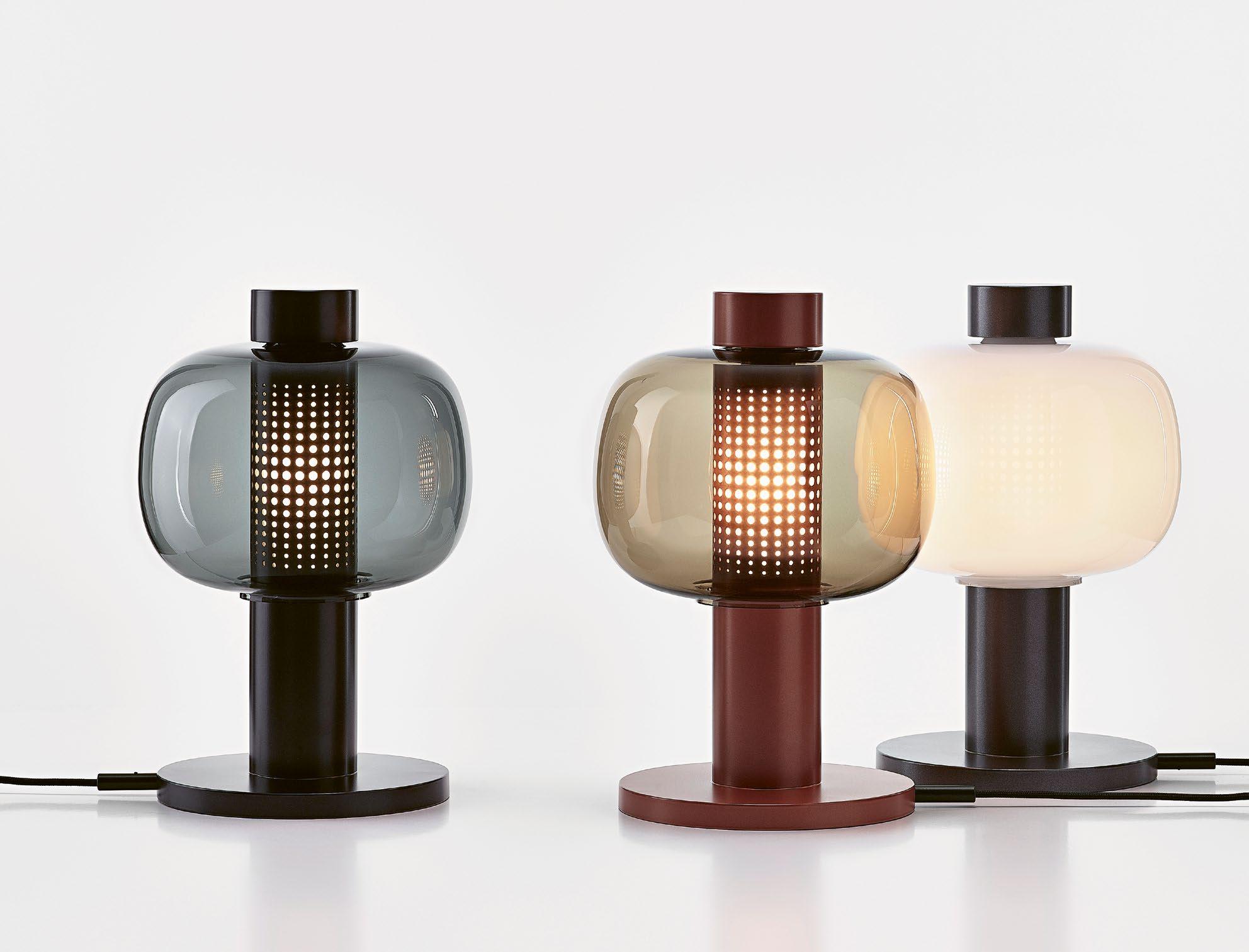 transparent, smoke brown, smoke grey, or opaline glass. The intensity of the experience can be modulated thanks to an integrated dimmer. The shape of the mantle, which serves as the shade and base in one, evokes a sense of levity and loftiness. A specialized method of glassblowing is needed to create the mantle as a single piece. The overall appearance of the light emphasizes the idea that beauty lies in simplicity.