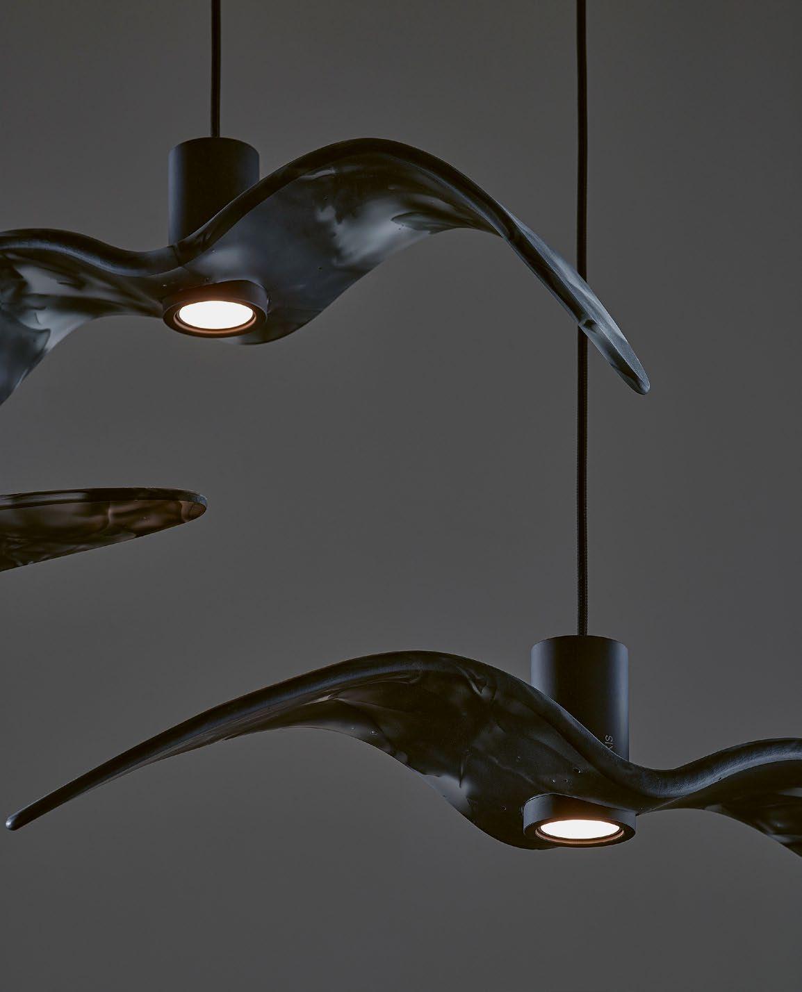 i nspired by the abandon and freedom of bird flight, the innovative Night birds suspension lights impart poetic enchantment and unparalleled dynamism to any interior. Night birds differ from the other collections in the unique technology applied in production, which involves melting glass into a mould and then bending it. The process makes it possible to instil delicate nuances in the shape of the wings and achieve a colouration of the glass that is different and wholly unique each time. The restraint and directness of the Night birds family are underscored by a minimalist LED light source. Night birds comprises three unique lights, each with a different wing position. They come