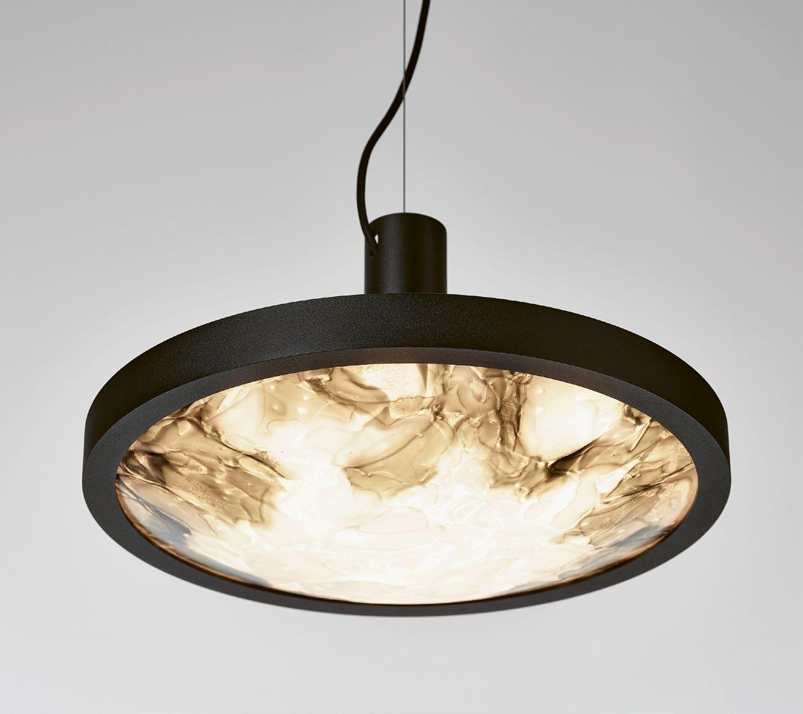 Geometric accentuates the aesthetic expression and structure of brokisGLAss which itself is remarkably distinctive. The collection is defined by basic geometric shapes that characterize the overall contours of the lights and instil them with a singular graphic element to achieve a striking contrast with the animate, almost sculptural makeup of the glass. The suspension components comprise glass geometric shapes, their edges rendered in black profiles. The circular and oval lights work well as solitary pieces, and multiples can also be arranged in a sort