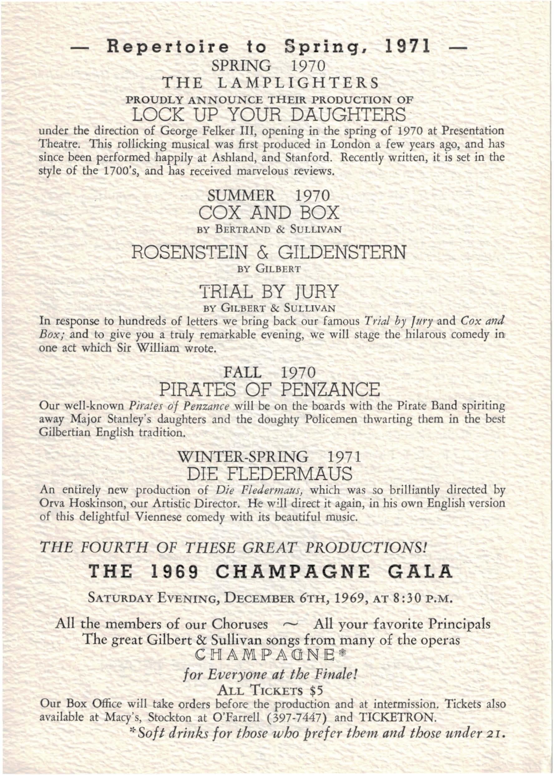 THE LAMPLIGHTERShave been selected as the recepient of the 1969 • 1970 San Francisco Sponsors Award, and we are proud to receive this honor. Present plans are for this money to go to an entirely new production.