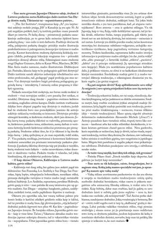 – Šiuo metu gyvenate Japonijos Okinavos saloje, išvykusi iš Lietuvos penkerius metus Kalifornijos dailės institute San Diege dėstėte madą. Tikriausiai tai – nepamirštamos patirtys... – „The Art Institutes“, trumpinamas kaip „Ai“, yra tarptautinė aukštojo mokslo įstaiga, JAV ir Kanadoje jų yra apie 50. Aš pati negalėjau patikėti, kad į tą institutą patekau: mane pasamdė iškart po interviu. Po kelių dienų – pristatomoji paskaita sausakimšoje auditorijoje, po to gavau kelis mėnesius išplėtoti kurso paskaitų planą – nuo nulio ir imti darbuotis. Pradžioje dėsčiau tik stilių, palaipsniui paskaitų daugėjo: prisidėjo mados iliustracija pradedantiesiems ir pažengusiems, koncepcijos vystymas ir mados istorija. Kasmet kuruodavau studentų diplominių kolekcijų renginio (didelis, prabangioje lokacijoje rengiamas šou – pritraukti industrijos dėmesį) albumo stilių. Sėkmingiausi mano studentai rengė Daphne Guinness, dirba su Kanye West, Marchesa, BCBG Max Azria mados namuose, mados iliustratoriais. Didžiuojuosi jais. Pasitaiko, klausia: kaip tu be pedagoginio gali būti dėstytoja? Dailės institutai samdė aktyvius industrijoje tebedirbančius savo srities profesionalus, tad „pedagogų“ pagal profesiją pas mus nebuvo. Visi dėstytojai turėdavo baigti privalomą pedagoginių pagrindų kursą – interaktyvią 3 mėnesių online programą ir išlaikyti egzaminą. Niekada nenorėjau būti mokytoja, nes buvau sunki mokinė ir studentė – visai nesvajojau sutikti į save panašių (bet sutikau, oi nesaldu). Dėstymas daug išmokė – pagreitino svetimos kultūros suvokimą, nugludino aštrius kampus. Dailės institute svarbiausias dalykas buvo abipusė pagarba tarp dėstytojo ir studento, juolab kad tie studentai buvo nuo pomokyklinio jaunimo iki antrojo aukštojo siekiančių verslininkų su šeimomis. Dėstytojas privalėjo užmegzti kontaktą su kiekvienu studentu, skirti jam dėmesio. Jokių laisvų temų: paskaitų išklotinė su vadovėlių, priemonių sąrašu, kiekvienos paskaitos tema, užduotimis, namų darbais ir vertinimo kriterijų lentele kiekvienai užduočiai pristatoma per pirmąją paskaitą. Studentas aiškiai žino, ko iš jo tikimasi ir ką išmoks išėjęs kursą – jokių spėliojimų ar „tu man nepatinki, todėl sėskis, 2“. Visa paskaitų medžiaga, įvertinimai ir komentarai kiekvienam studentui asmeniškai yra prieinami internetinėje paskaitos platformoje. Į paskaitų išklotinę dėstytojas taip pat įtraukia ir taisykles, kurių studentai turės laikytis – nieko nesuvokiamo, viskas drausmės ir skaidrumo vardan. Paskaita trunka 4 valandas, tad jokių bimbinėjimų, tik produktyviai praleistas laikas. – O kaip skiriasi Okinavos, Kalifornijos ir Lietuvos mados kultūra, gatvės stilius? – Kalifornija turi daug stilių, bet galima juos atskirti pagal tris didmiesčius: San Fransiską, Los Andželą ir San Diegą. San Fransiskas, hipių lopšys, tebeprijaučia bohemiškam, meniškam stiliui, pirmauja ekologiško vartojimo ir tvarios mados (angl. sustainable fashion) kultūroje. Los Andželas, suprantama, paveiktas Holivudo, gatvės gaujų ir retro – man patinka iki ausų tatuiruotos pin-up gatvės madistės. San Diegas – atsipūtęs: banglentės, palmės, saulėlydžiai, nudrėksti šortai, smėlis paplūdimio šlepetėse ir mašinoje. Okinava yra egzotiška sala, kur vasarą taifūnai palmes prie žemės lenkia ir karščiui atlaikyti grūdintis reikia kaip ir šalčiui, tad tai paveikia ir madą: linas, ilgi plevėsuojantys, „vėją keliantys“ drabužiai padeda išgyventi tuos plius 40. Kas kita – pagrindiniame Japonijos žemyne. Be harajuku stiliaus, Japoniška gatvės mada – kaip ir visur kitur. Tačiau į Vakaruose aktualias mados tendencijas japonai nekreipia dėmesio, tad ir vakarietiškas vintažas čia – nepopuliarus. Užtat japoniškas gatvės stilius boro – vintažo 118