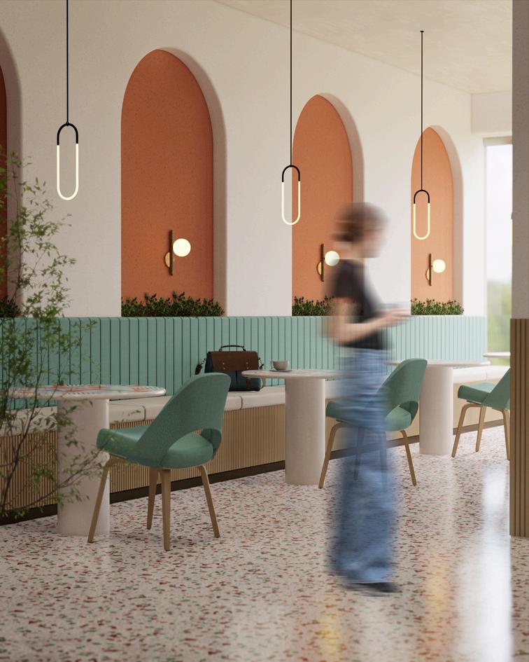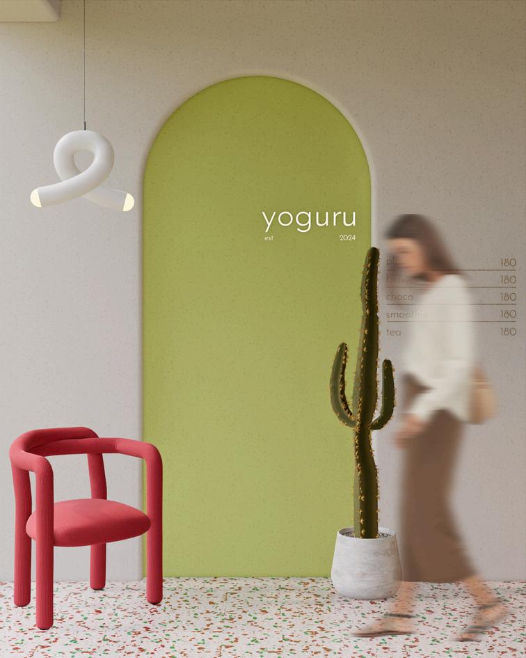 A yogurt bar floor that features terrazzo flooring with colorful specks scattered throughout, adding texture and visual interest to the space.