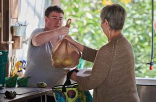 Supported farmer, Christina Waple, hands CSA produce to a member on a Friday morning pickup.