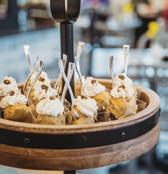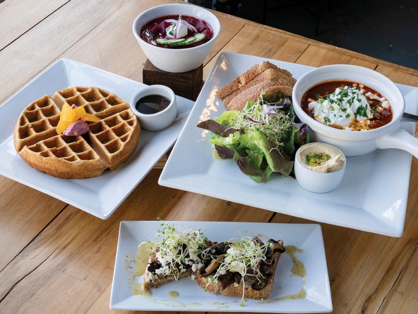 stable. For example, a frittata is on the menu, but its ingredients change depending on what’s fresh and in season. “We create a high-quality product that comes from the bounty of the earth. It yields a better product when you’re incorporating seasonal ingredients. Items such as our greens change seasonally, and the whipped butter that’s served with our waffles also incorporates seasonal ingredients,” Ella explains.
