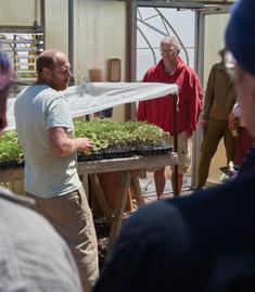 Supported farmers, Cristian Phibbs and Christina Waple, sort produce in Homefields’ barn with farm manager, Tony Beers.
