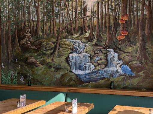 BEFORE REOPENING, renovations were made that included installing a live-edge wood bar top, re-upholstering chairs and banquettes, and adding hanging planters and moss installations. A mural was also completed. Ella describes it as depicting a full day in the forest, and credits Ben, Bernadette Goetz, Shauna Yorty and Schon Wanner as being part of the collaborative effort. The mural features a variety of plants and animals, including the amanita mushroom that gives the café its name.