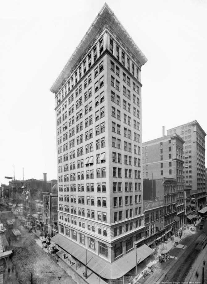 Historical photo documenting the world's first reinforced concrete skyscraper in 1903.
