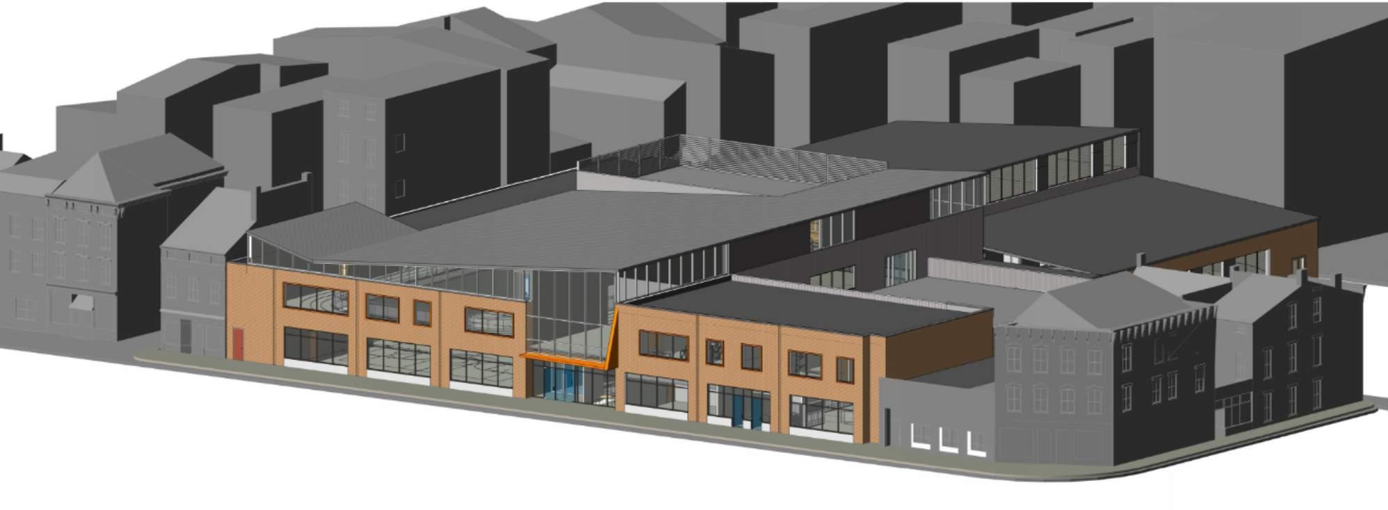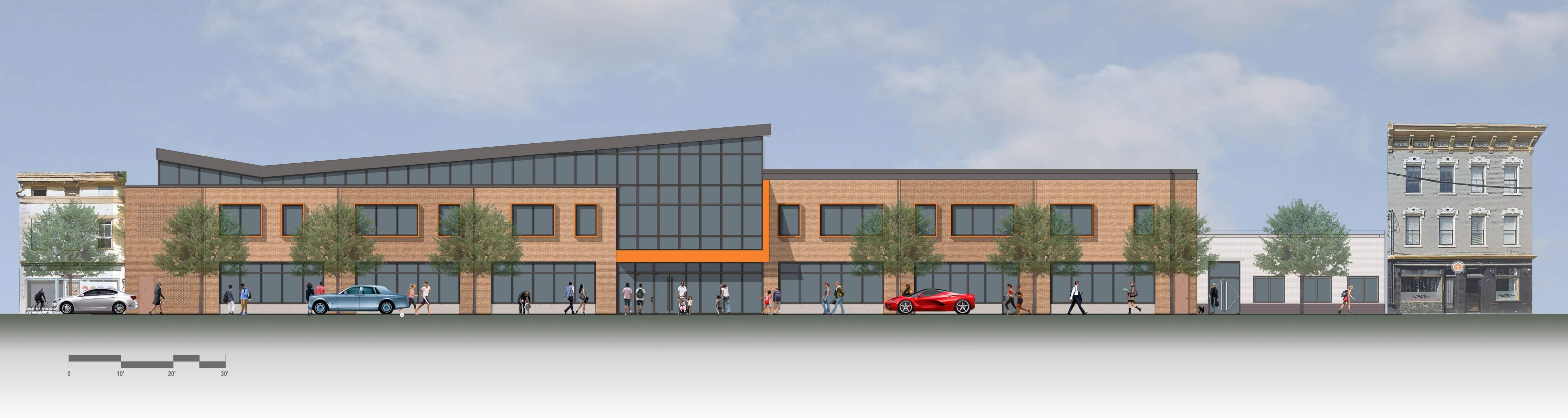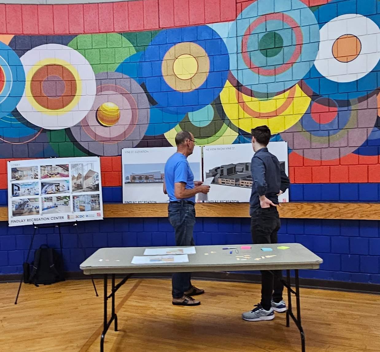 Lance Brannock, 2024 Findlay Community Recreation Center Primary elevation with main entry. Context axonometric. Attending a community engagement meeting.