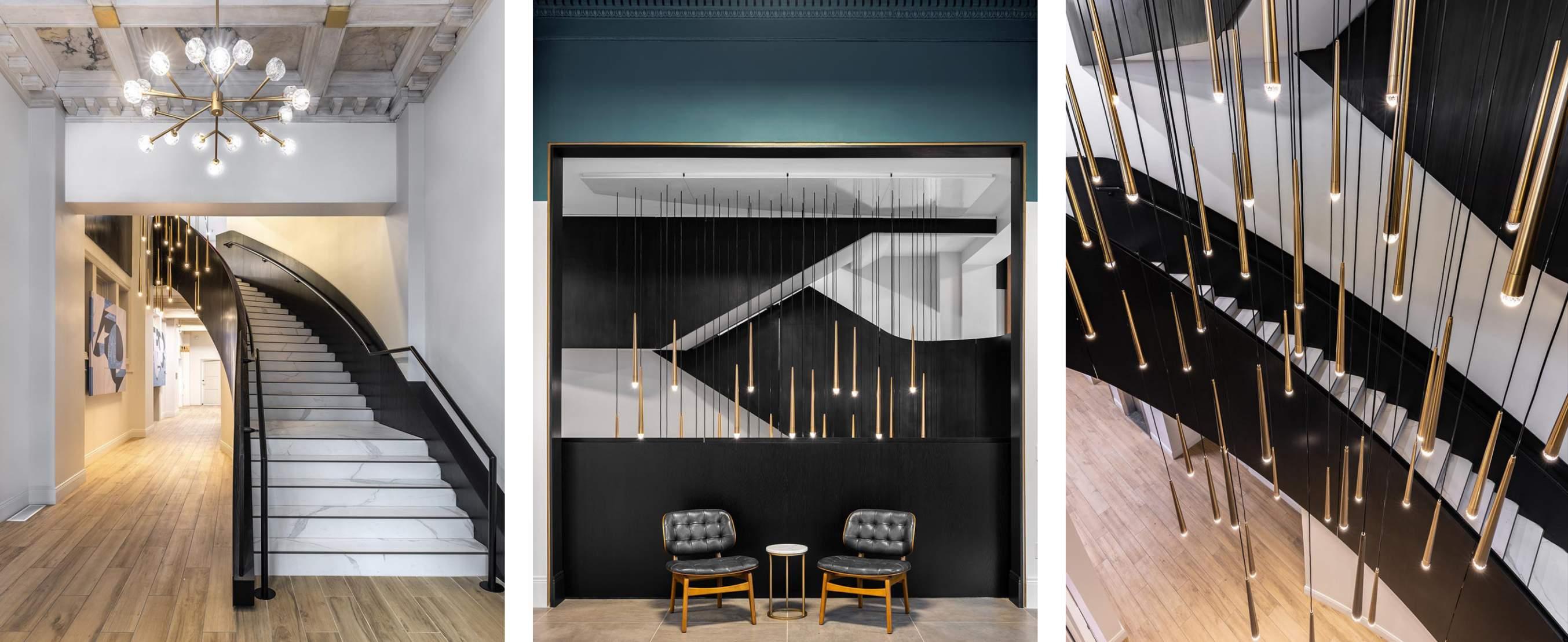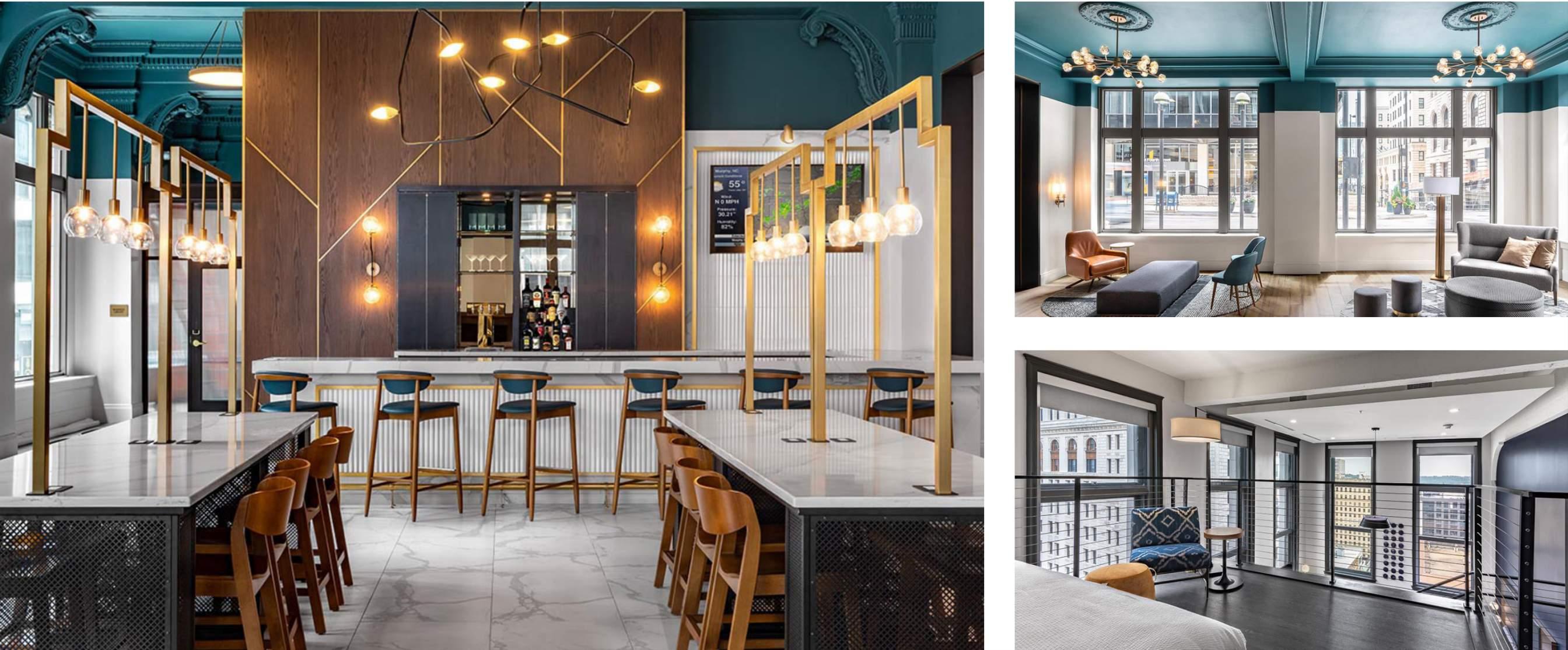 Completed photography. Hotel rooms (top right), public bistro (top left), and entry lobby (bottom).