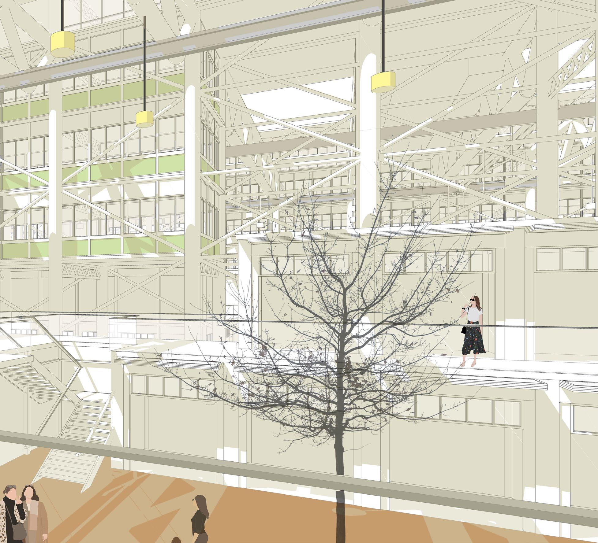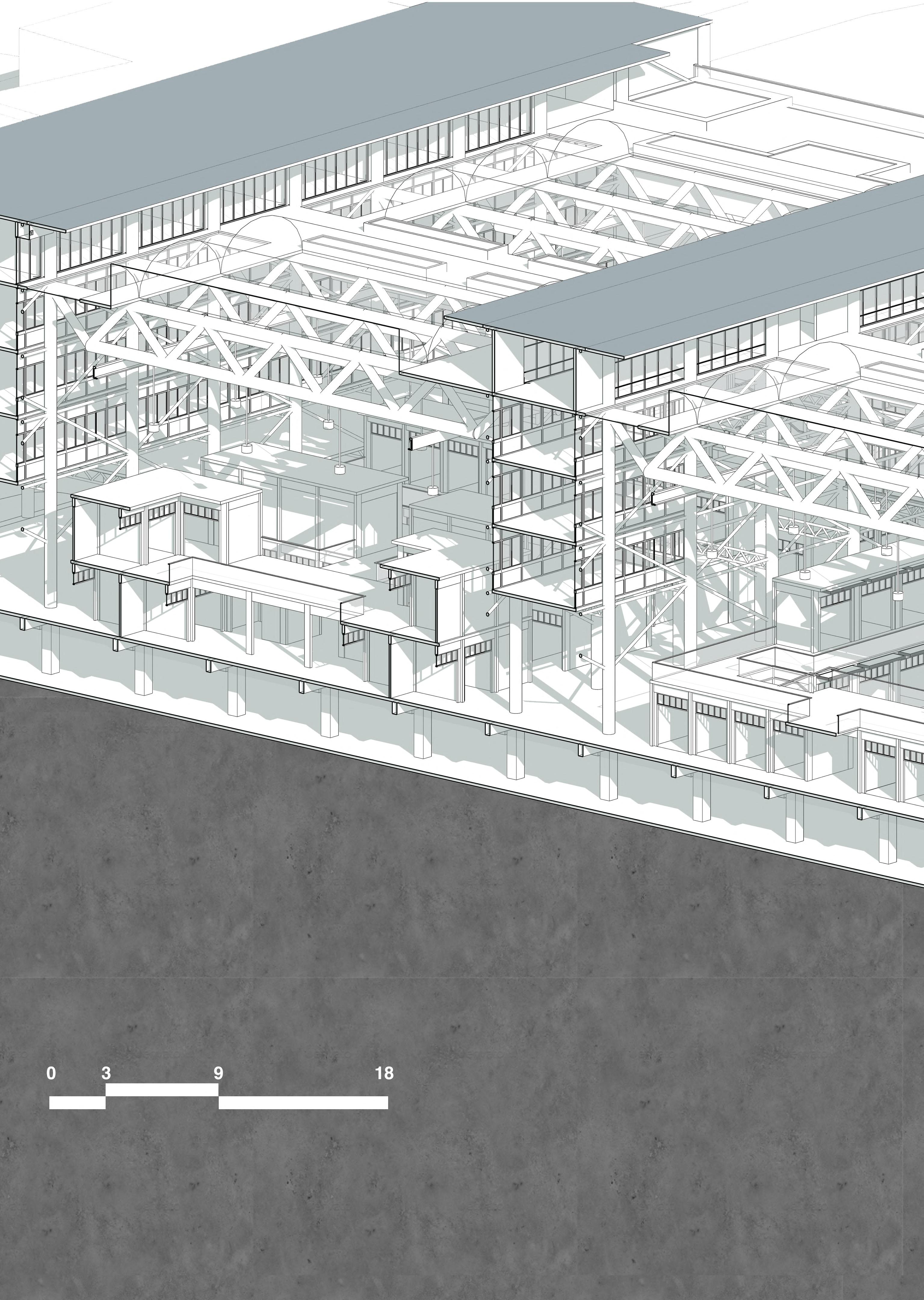 The building would consist of three great halls (30m x 18m) that would house about 400 stalls. Sunlight enters the building through massive skylights on the roof.