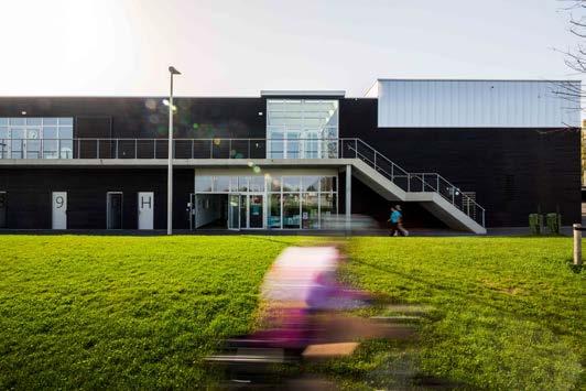 The new building is built against the warehouses of the existing container park, leaving enough space for a generous sports park as a continuation of the adjacent nature area. The building is enwrapped with a black wooden cladding and has an contrasting ‘crown’ of white polycarbonate panels. A concrete passerelle on the first floor constitutes a functional connection between interior and exterior and leads towards a large terrace, adjacent to the cafeteria and overviewing the sports park.