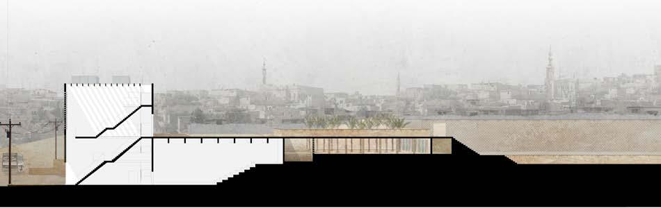 The two retaining walls reinforce the existing spatial conditions of the present open space into a set of clearly demarcated chambers. The northern chamber is elaborated as an intimate, multi-leveled garden which consists of rather defined spaces which can simultaneously operate separately. In contrast to the intimate garden, an exposed urban plaza between both retaining walls can be considered as an undefined plain which can be flooded by a numerous amount of activities, whether related to its adjacent buildings or as an entity on its own. Finally, the southern flank presents itself as a ‘Palestinian greenscape’ amidst the camp’s southern tissue, providing a collection of shaded spaces of stillness and slow passageways, elevated above the fuss of the plaza.
