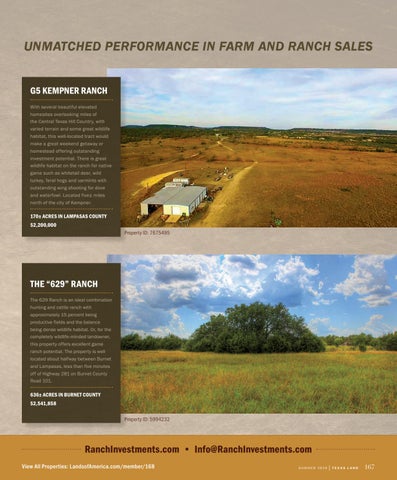 UNMATCHED PERFORMANCE IN FARM AND RANCH SALES G5 KEMPNER RANCH With several beautiful elevated homesites overlooking miles of the Central Texas Hill Country, with varied terrain and some great wildlife habitat, this well-located tract would make a great weekend getaway or homestead offering outstanding investment potential. There is great wildlife habitat on the ranch for native game such as whitetail deer, wild turkey, feral hogs and varmints with outstanding wing shooting for dove and waterfowl. Located five± miles north of the city of Kempner.
