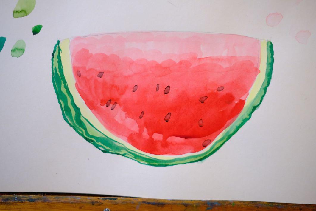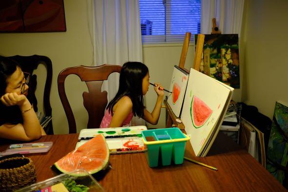Within a week of learning how to play the violin, she has the ability to understand the music, and the instrument that produces those amazing sounds. Likewise in art, she picks up the brushes for the first time and yet she paint a realistic looking watermelon after only one try. This is not painting by the numbers. She figures out how to apply the watercolor to get the shades and tones for the object in front of her. Her dad is thoroughly impressed.