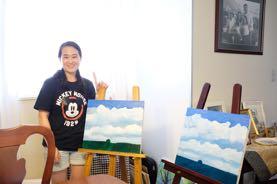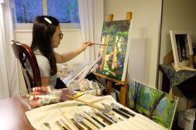 Minnie’s student is showing o her oil painting at an early phase of the art project.