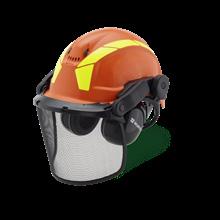 >> Mit Helm, Metallgittervisier, Gehörschutz und Aufkleberset