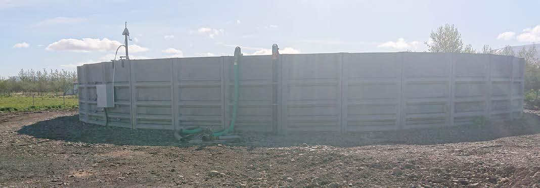 Á útmánuðum 2018 var ljóst að ekki var unað við ástandið lengur, tilraunir við að laga pokann og hræra upp í honum með ýmsum aðferðum höfðu með öllu mistekist. Eigendur búsins lögðust á sveif með okkur og fjármögnuðu byggingu nýrrar hauggeymslu. Það má skjóta því að að búið leigir allar byggingar og jarðnæði af eigendum. Eftir að hafa farið yfir ýmsa kosti og leitað tilboða var ákveðið að byggja haugtank úr forsteyptum einingum. Þær voru keyptar frá Kaupfélagi Skagfirðinga og eru framleiddar í Danaveldi. Hver eining er 4 metra há, 2,3 metra breið og þurfti 37 einingar til að búa til tank sem er 28 metrar í þvermál, 615 fermetrar að grunnfleti og rúmar 2.300 rúmmetra af mykju en það fer langt með að rúma ársframleiðslu búsins. Verktakar í nágrenninu sáu um jarðvinnu og gerð botnplötu en verktakar frá Sauðárkróki með sérþekkingu sáu um uppsetningu eininganna.