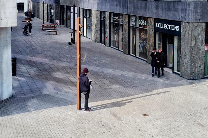 Mynd 58: Einstaklingur staldrar stutt við staur og lítur í símann sinn.