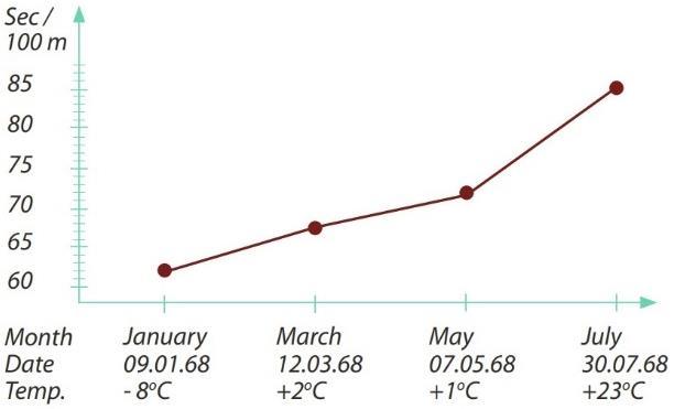 Mynd 18: Meðalhraði yfir 100 metra á gangandi vegfarendum sem valdir voru af handahófi í janúar, mars, maí og júlí. Gönguhraðinn er mestur í janúar þegar kalt er í veðri og svo smá dregur úr hraðanum með hækkandi hitastigi (Gehl og Svarre, 2013)...............................18