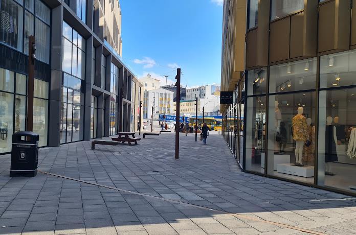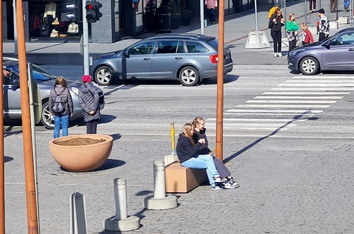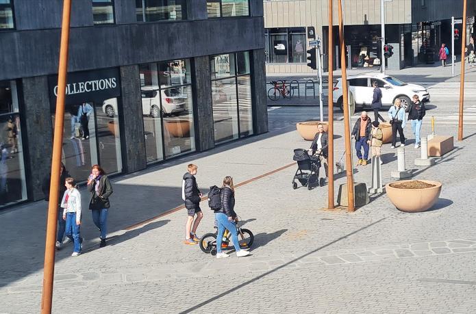 Mynd 57: Talsvert minni umferð var í gegnum torgið frá norðvestri til austurs og öfugt. Enginn settist á bekkina sem voru í skugga en sjá