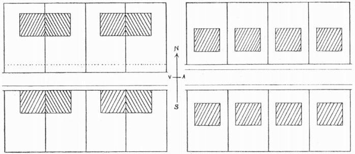 Mynd 5: Hagnýting lóða. Til vinstri er dæmi um góða hönnun með tilliti til sólar, auk þess sem lóðin er heillegri og nýtist betur heldur en á fyrirkomulaginu til hægri (Guðmundur Hannesson, 2016).